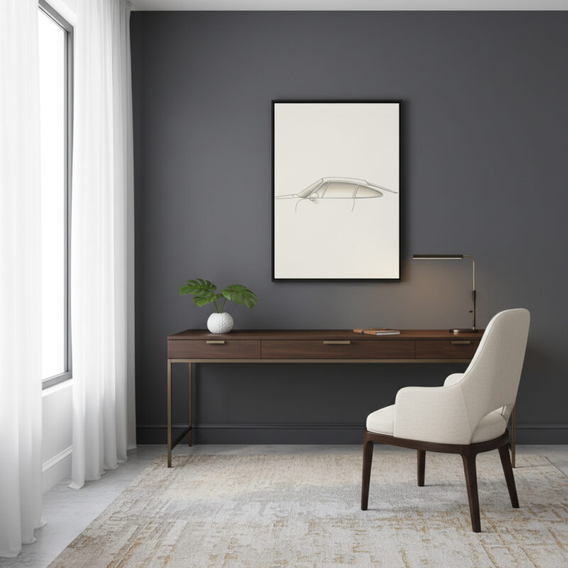 Encased in a handcrafted matte black wooden frame, the artwork blends sophistication with passion, making it the perfect piece for living rooms, man caves, offices, or garages. Whether you’re a Porsche enthusiast or simply love clean modern décor, this framed poster is a striking addition to any wall.