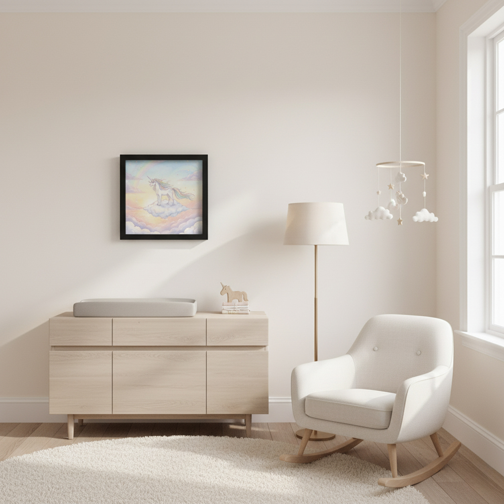 Step into a world of imagination and beauty with our Enchanted Unicorn Dreamscape – 12×12 Framed Wall Art. Featuring a graceful unicorn standing proudly on a cloud, surrounded by soft pastel skies, rainbows, and twinkling stars, this piece radiates serenity and inspiration.