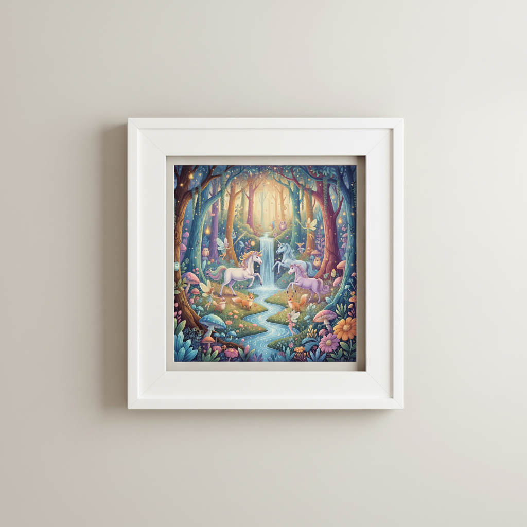 Step into a magical forest with this 12×12 handcrafted unicorn wall art frame. Featuring dreamy unicorns, glowing woods, and whimsical details, set in a sleek white square frame. Perfect for kids’ rooms, nurseries, or fantasy-inspired décor.