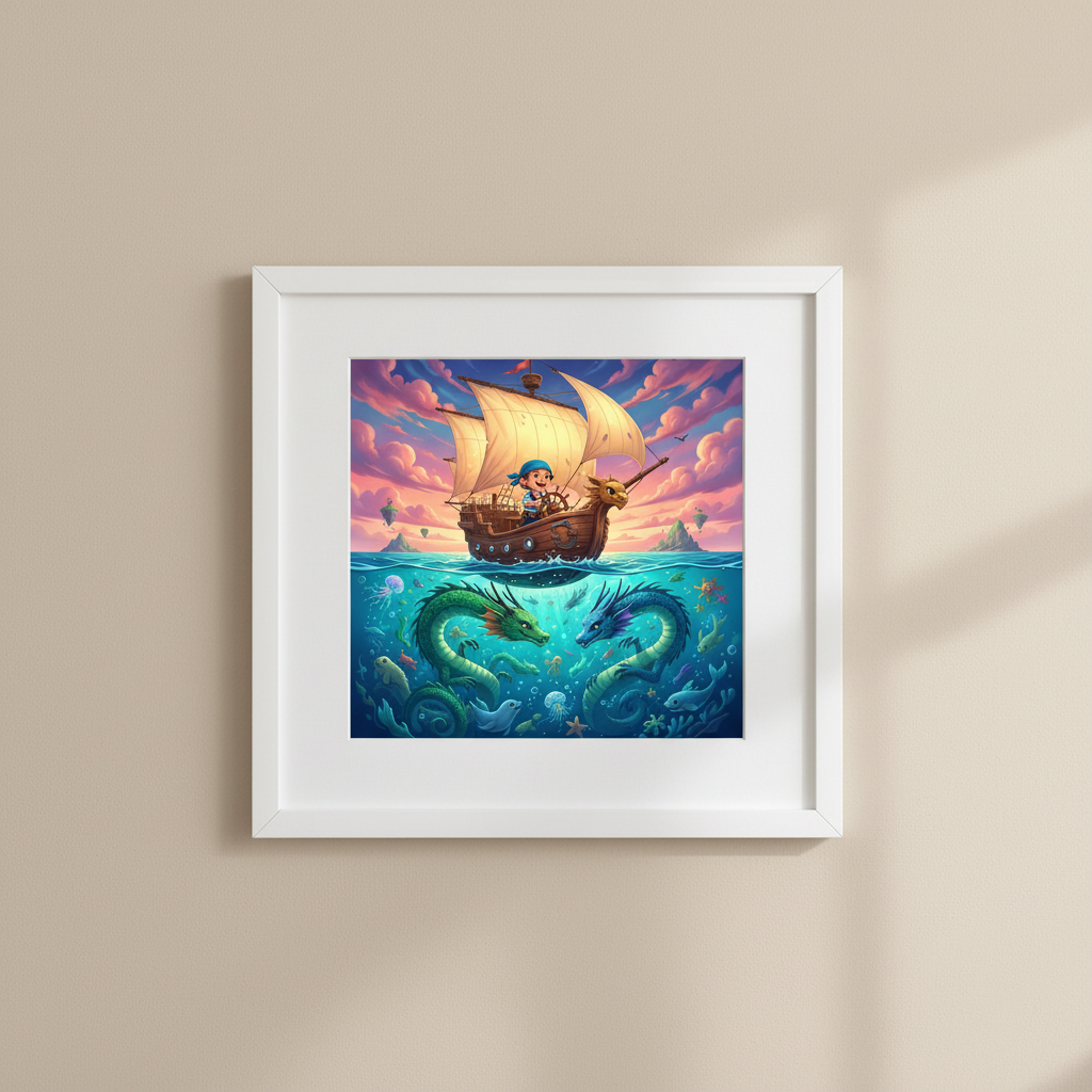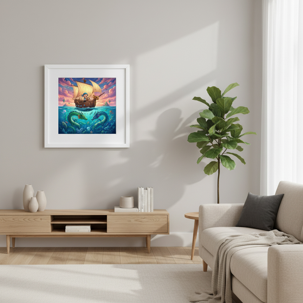 Elevate your interior design with a piece that sparks imagination and conversation. This meticulously crafted 12×12 (square) framed art print, titled “The Pirate & The Sea Dragons,” is more than just decor—it’s a window into a world of myth and adventure, designed for the discerning collector.