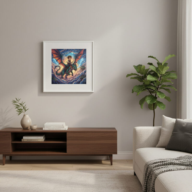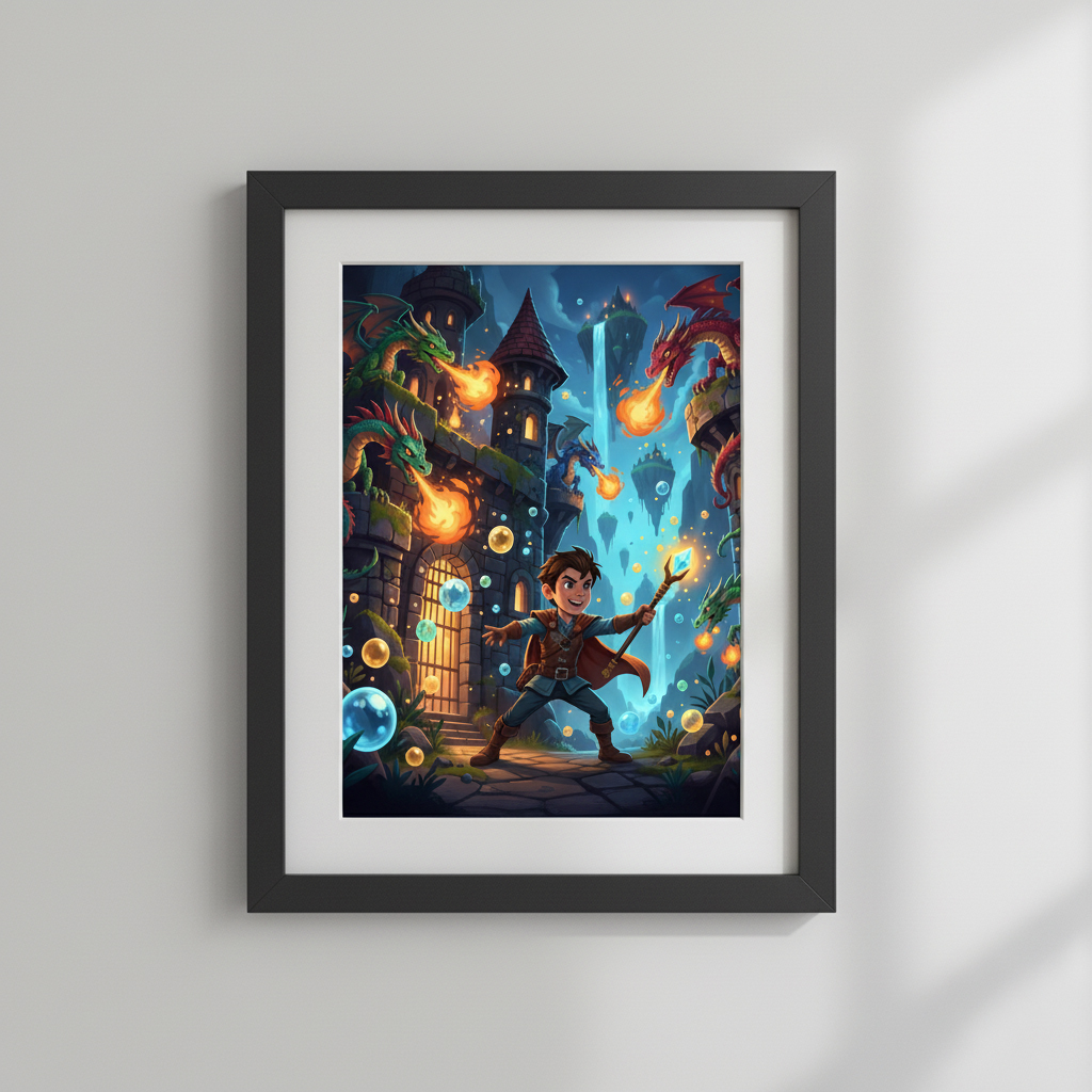 Command the forces of magic with this breathtaking 8×12 (A4) premium framed art print. Featuring a brave young mage confronting fire-breathing dragons outside a majestic fortress, this vibrant illustration is an ode to courage and high fantasy. Elegantly framed in sleek black, it’s the perfect statement piece for inspiring creativity in a child’s room, library, or games room.