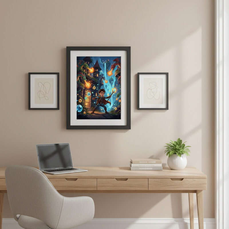 Ignite the imagination and anchor your decor with a dramatic piece of narrative art. This meticulously detailed 8×12 (A4 size) framed print, “The Young Mage & The Dragon Keep,” captures a pivotal moment of heroism and magic, rendered in a stunning, high-fantasy style.